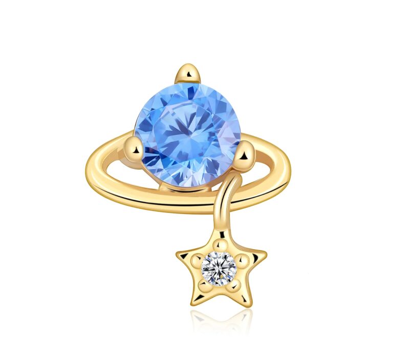 The 3.0mm aquamarine CZ adds a clear pop of color, while the 1.0mm star detail brings a subtle “night-sky” touch. It’s an easy piece to wear as a gentle focal point—fresh, feminine, and clean enough to pair with minimalist gold basics.