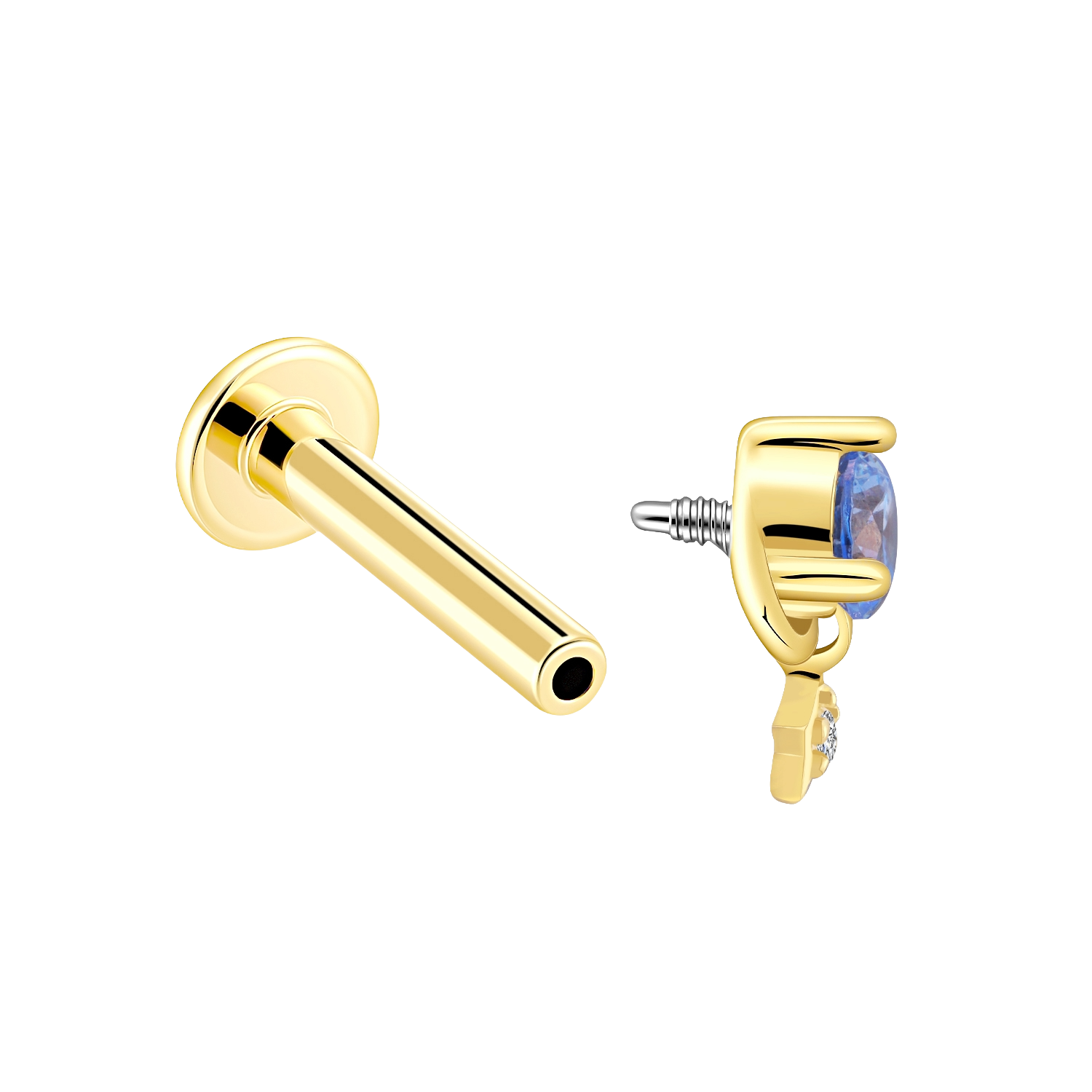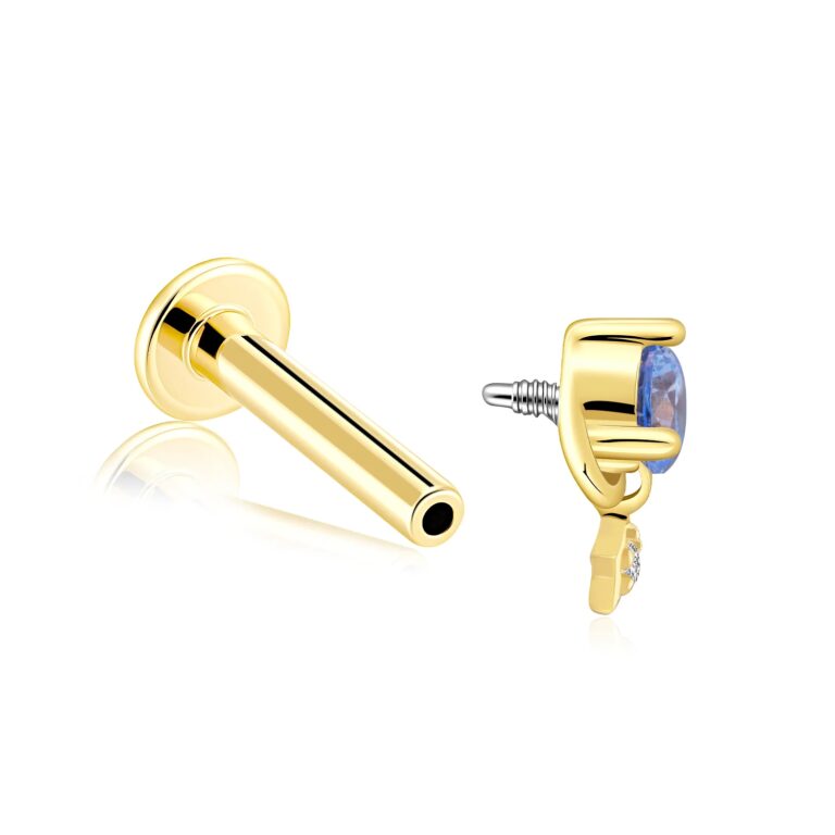Made from 14K solid gold with aquamarine cubic zircon and a star accent detail. Internally threaded labret stud style. Thread: 0.9mm. Cubic Zircon: RD 3.0 * 1, RD 1.0 *