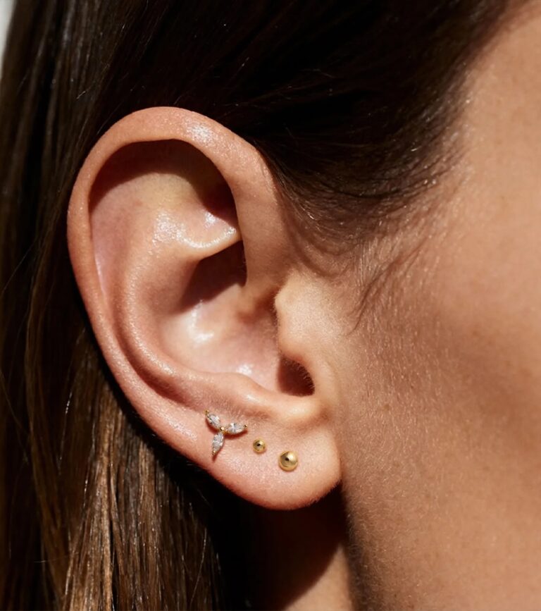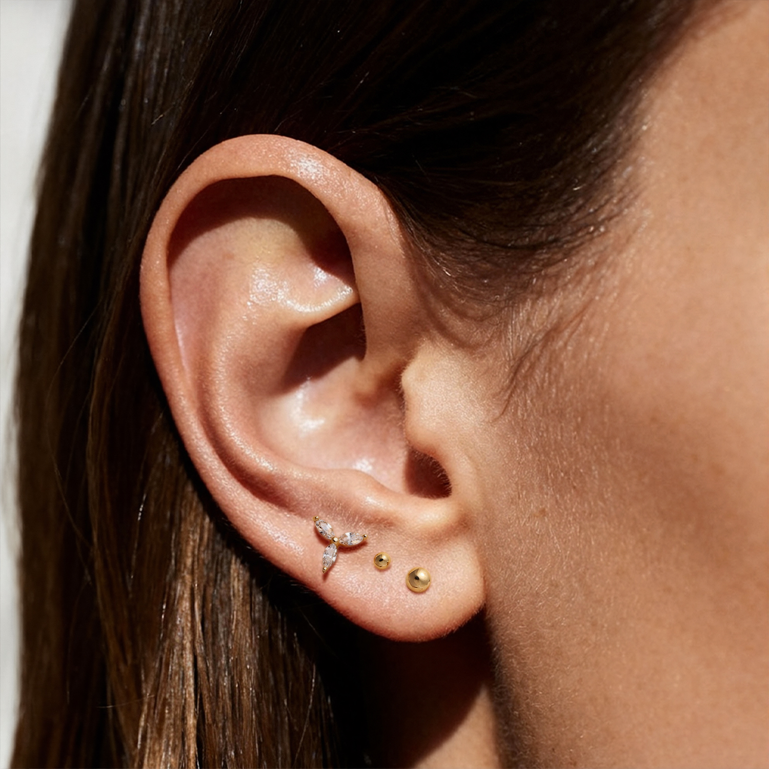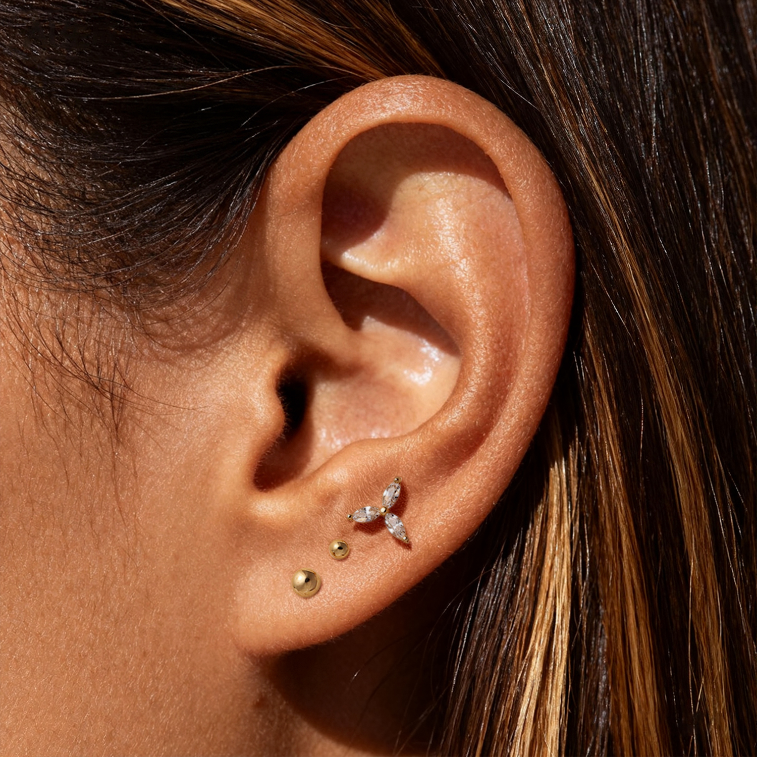 The clover silhouette adds a soft, classic touch, and the CZ stones give a neat shine without looking too flashy. It’s a versatile piece that works well on its own or paired with plain gold studs for a balanced stack.