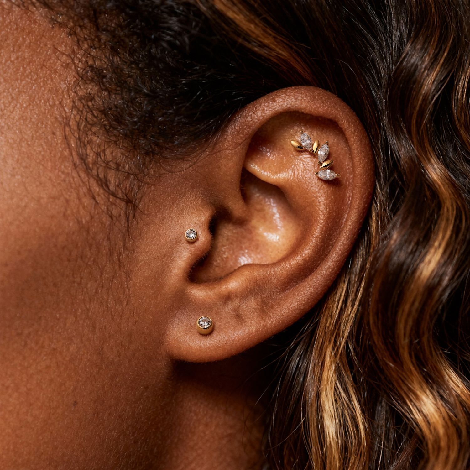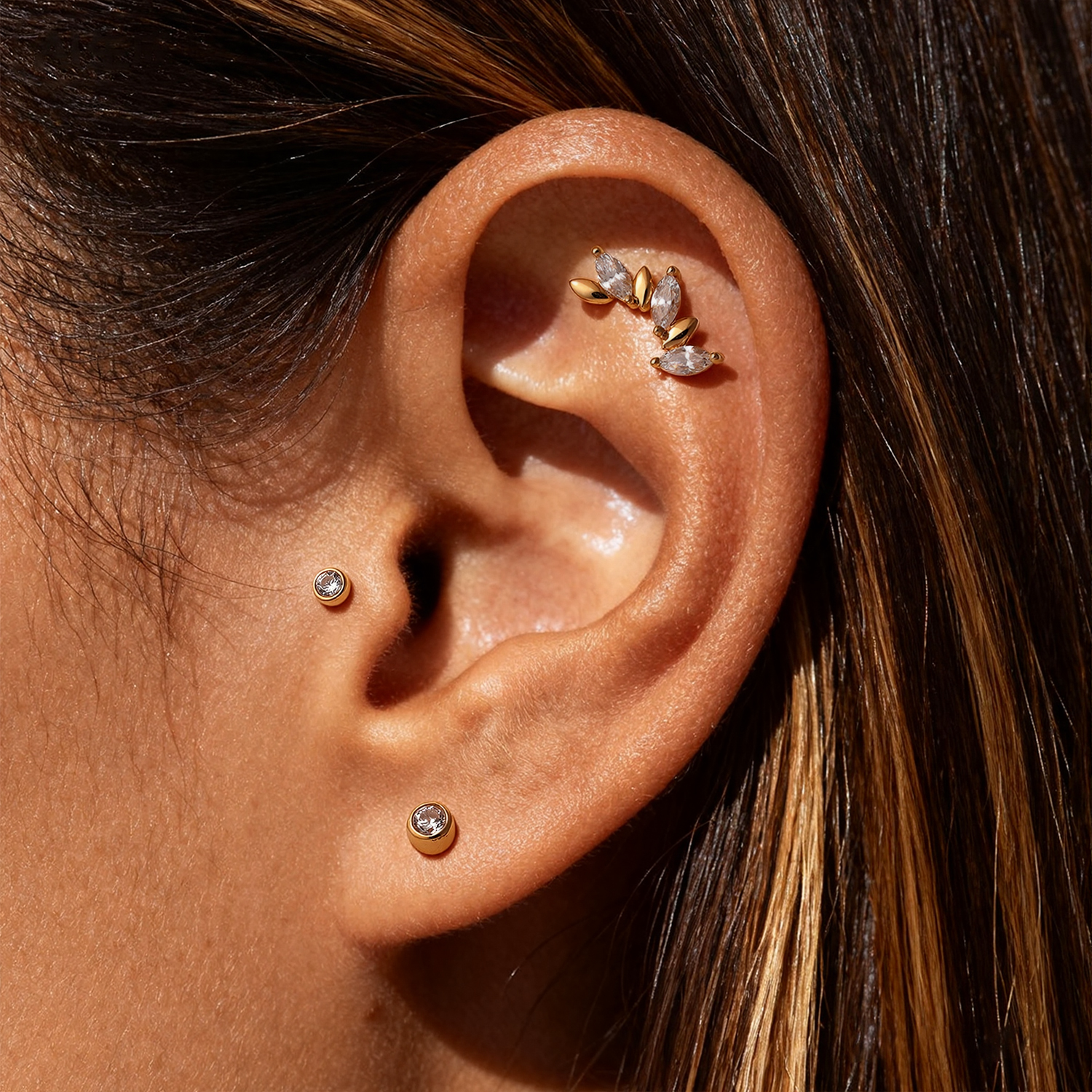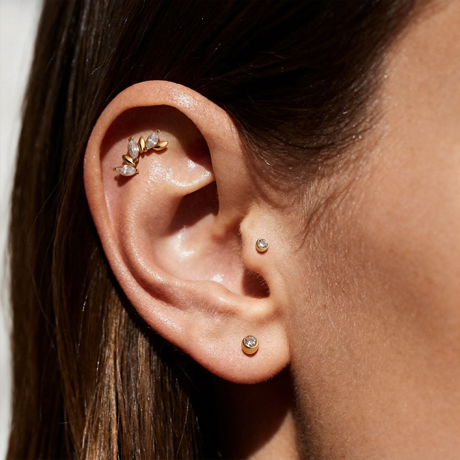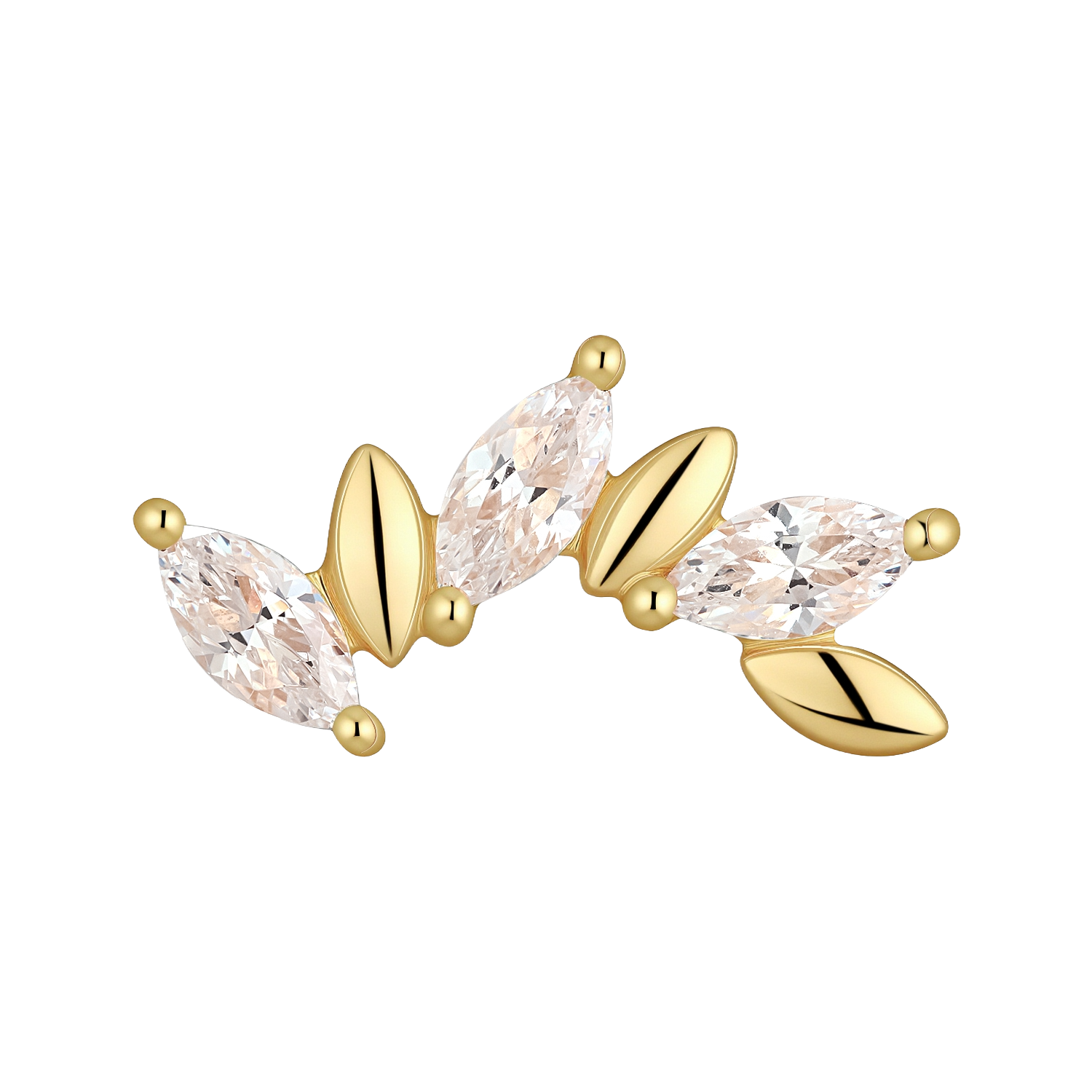 The clear CZ adds crisp sparkle that reads elegant rather than flashy, making it easy to pair with minimalist gold studs or more detailed statement ends. It’s a great option when you want a polished look that feels modern, balanced, and easy to style across different placements.