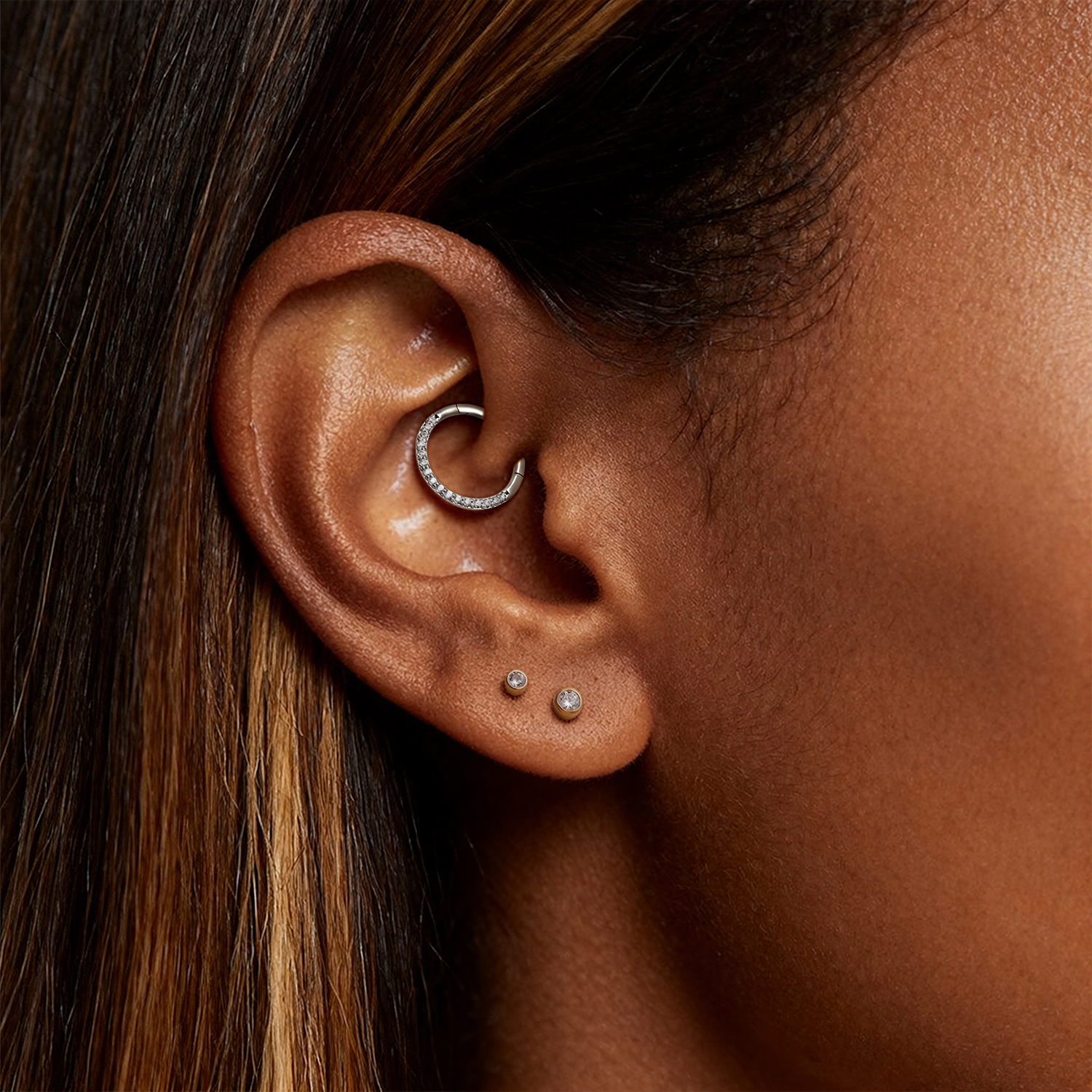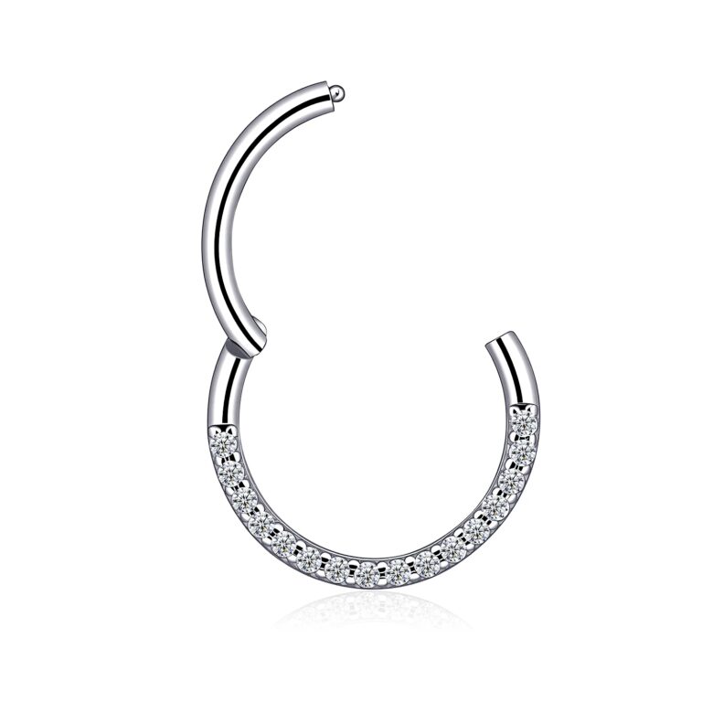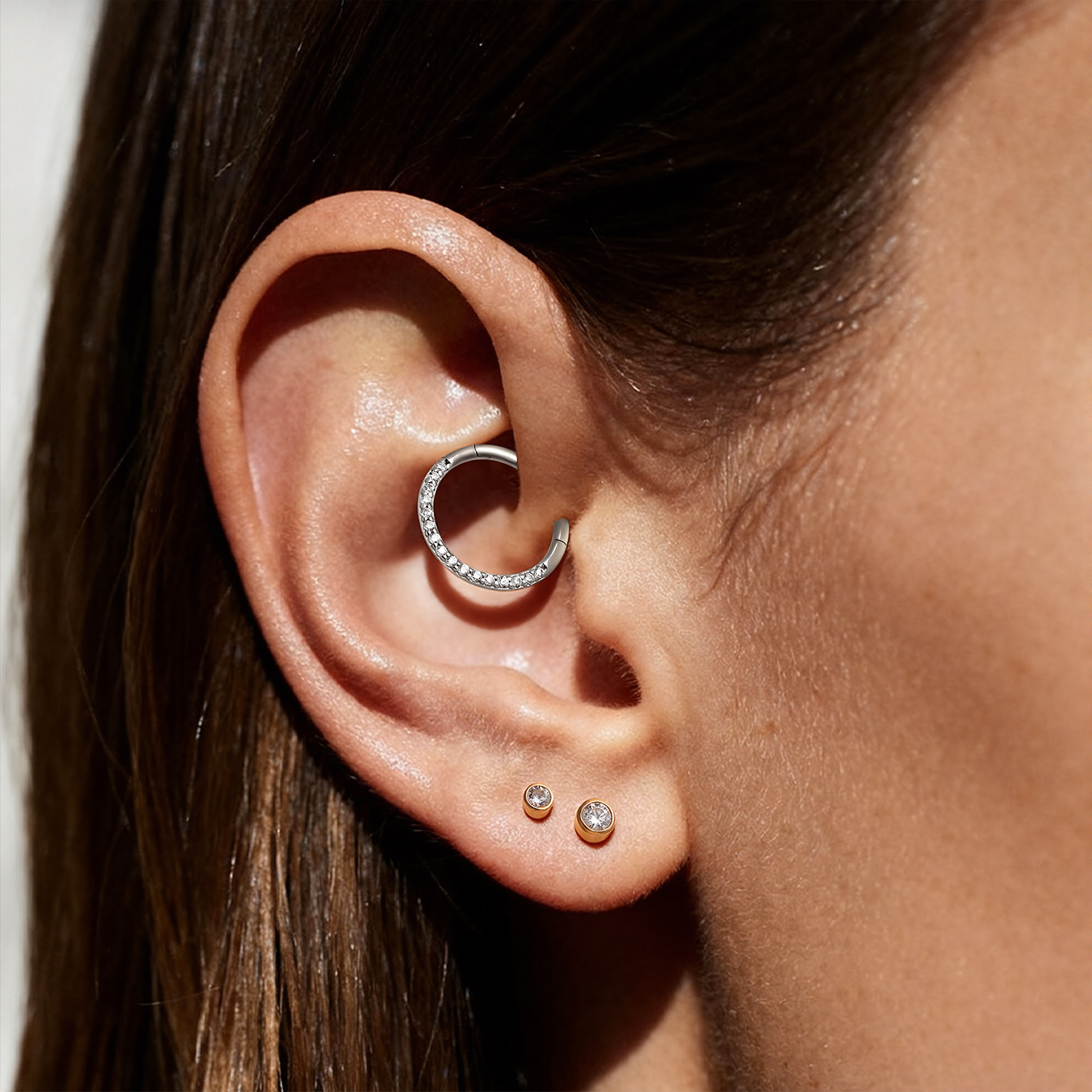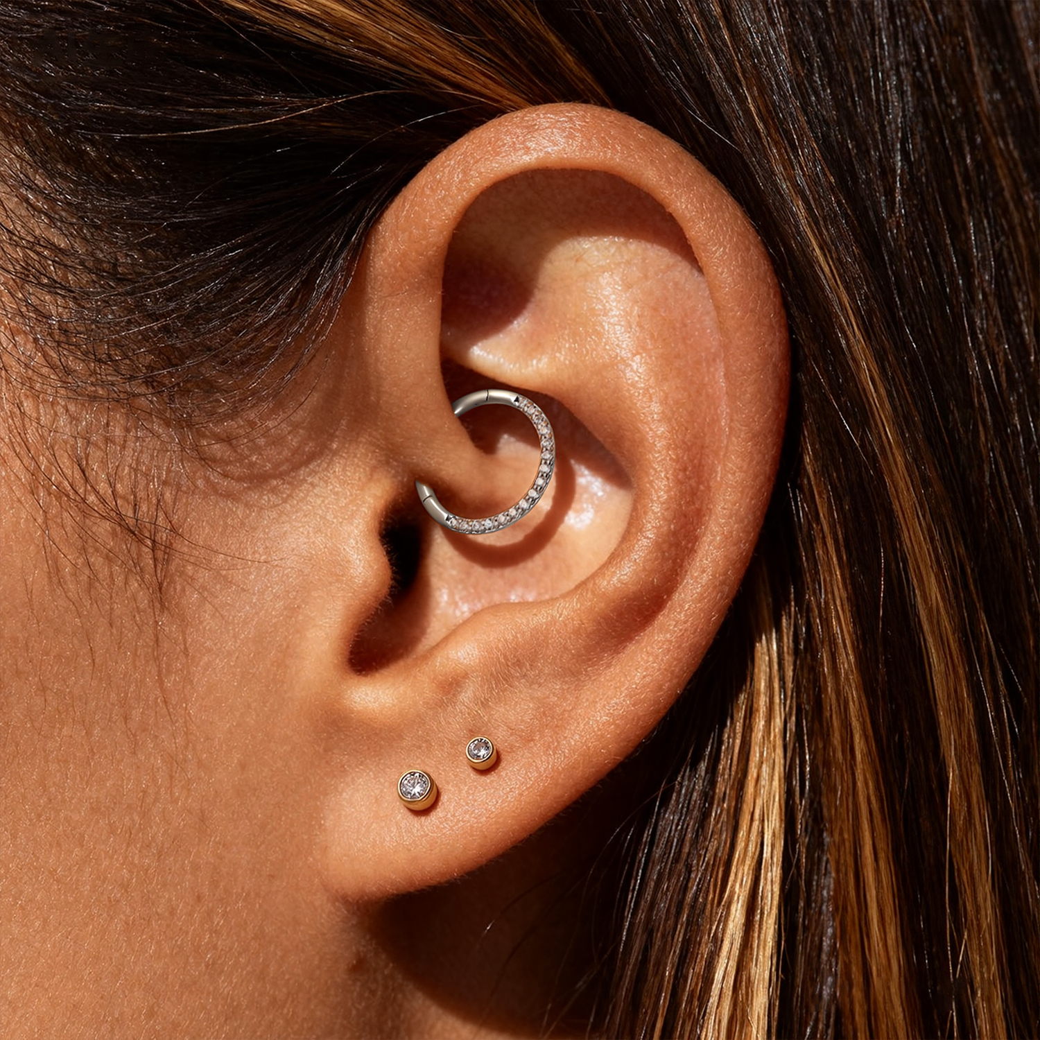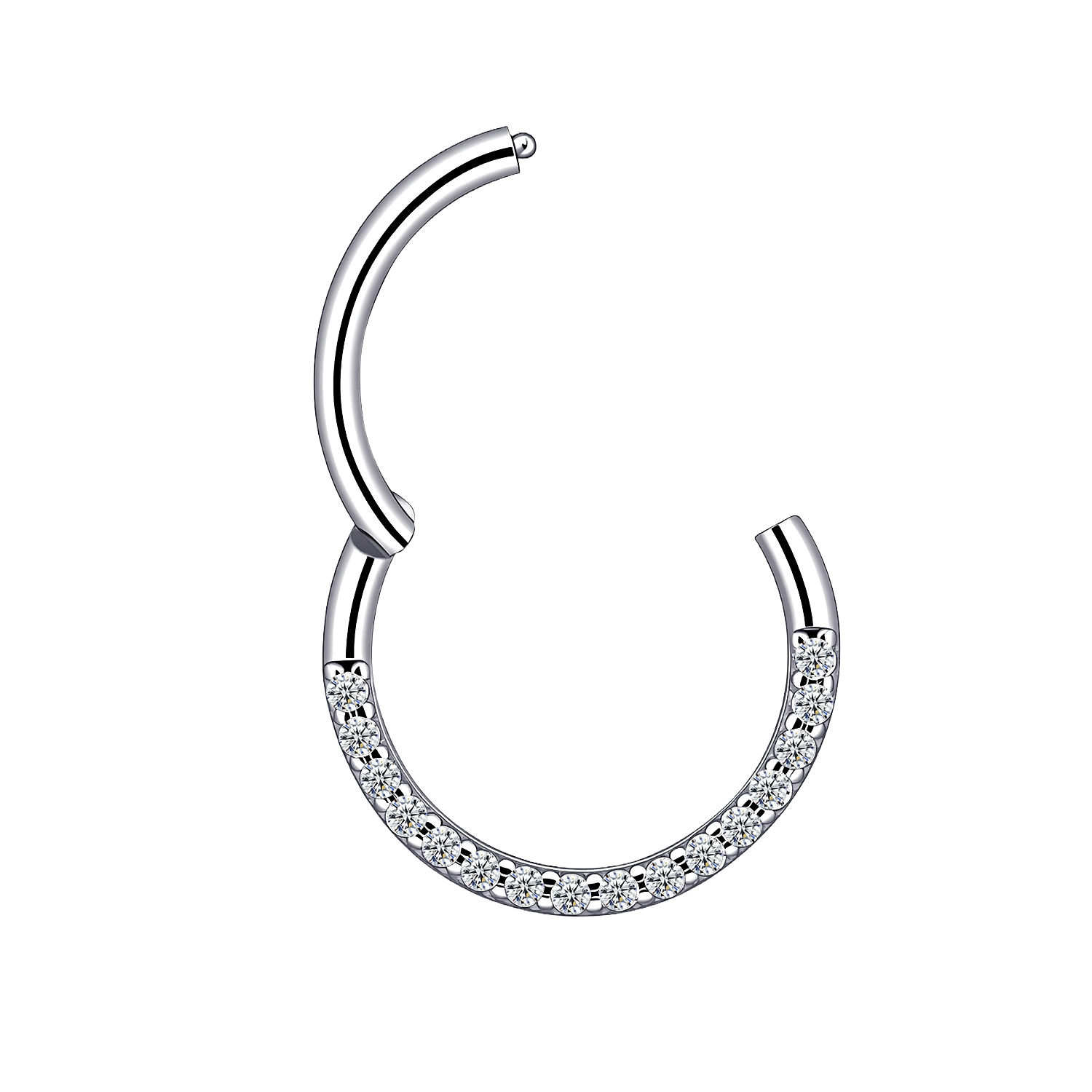 A clean, CZ-lined clicker made for everyday shine. It keeps the profile simple while adding a crisp sparkle that works across both ear and septum styling.