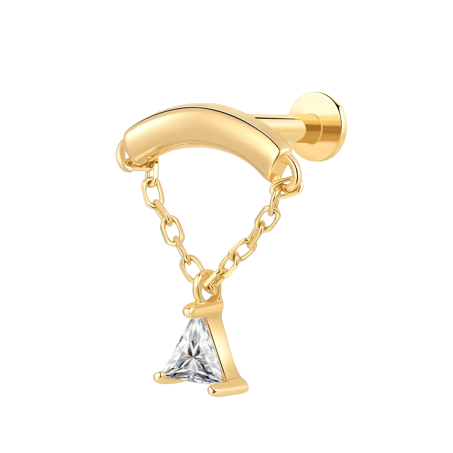 KE227G-CL16 is a 14K solid gold internally threaded flat back labret stud with a triangle CZ charm and a slim chain dangle for a modern, light-catching finish. 14K Solid Gold + Stainless Steel Thread (0.9mm) + Cubic Zircon (TA = 3.0mm * 1) + Chain (15mm)