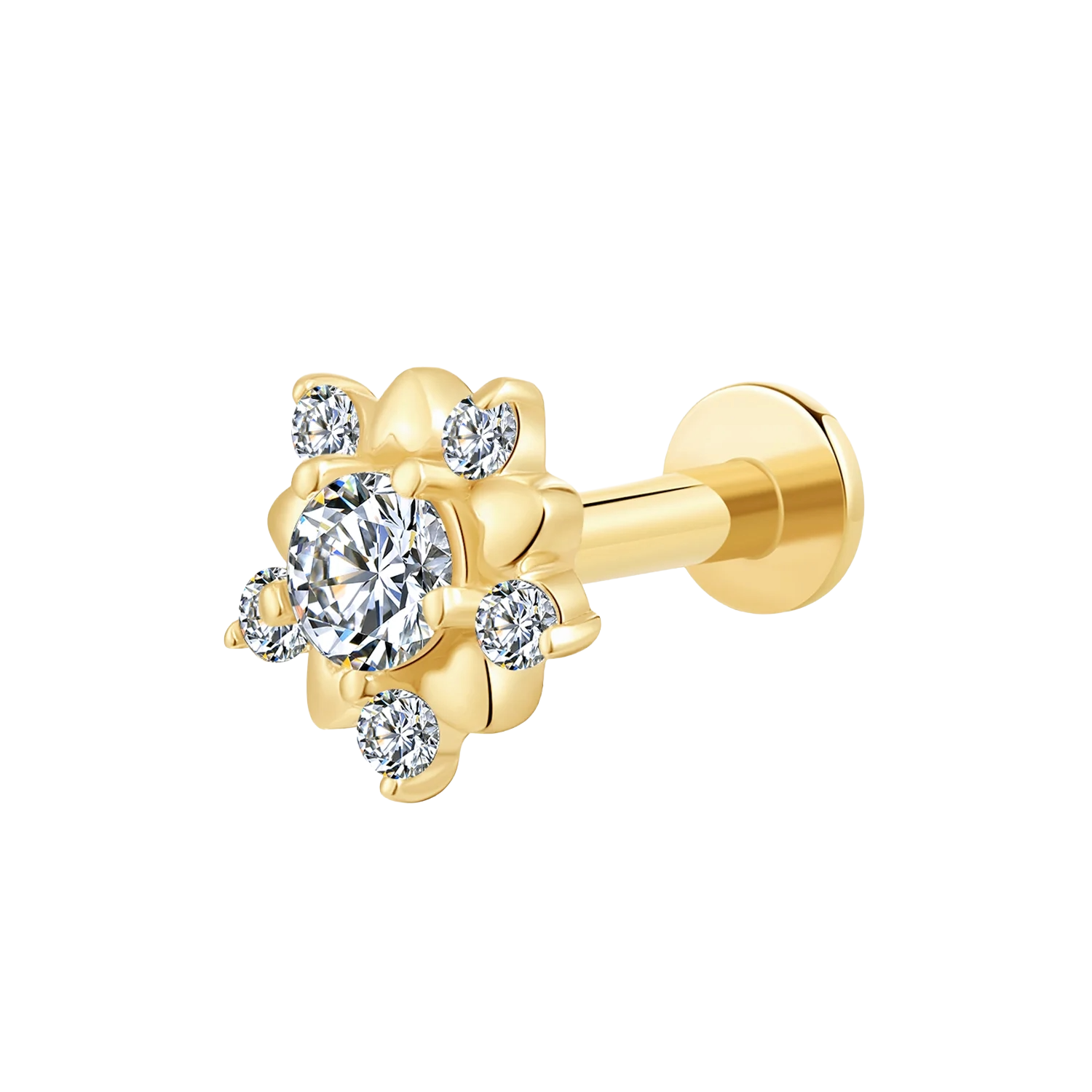 Made from 14K solid gold with prong-set clear CZ petals in a flower design. Internally threaded labret stud style with stainless steel thread. Thread: 0.9mm.