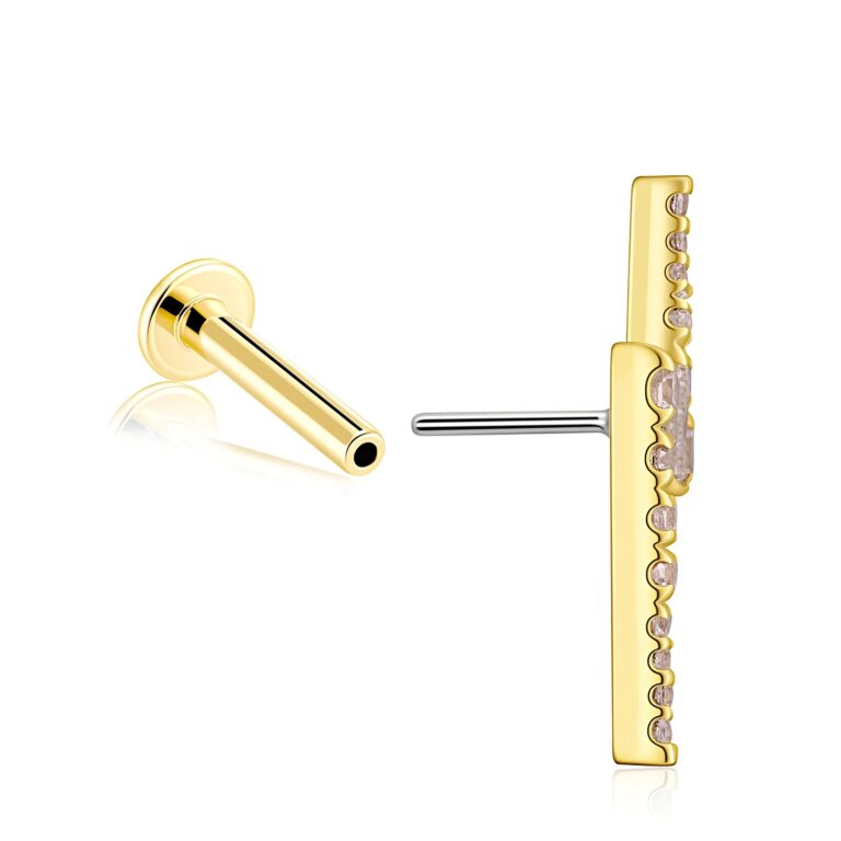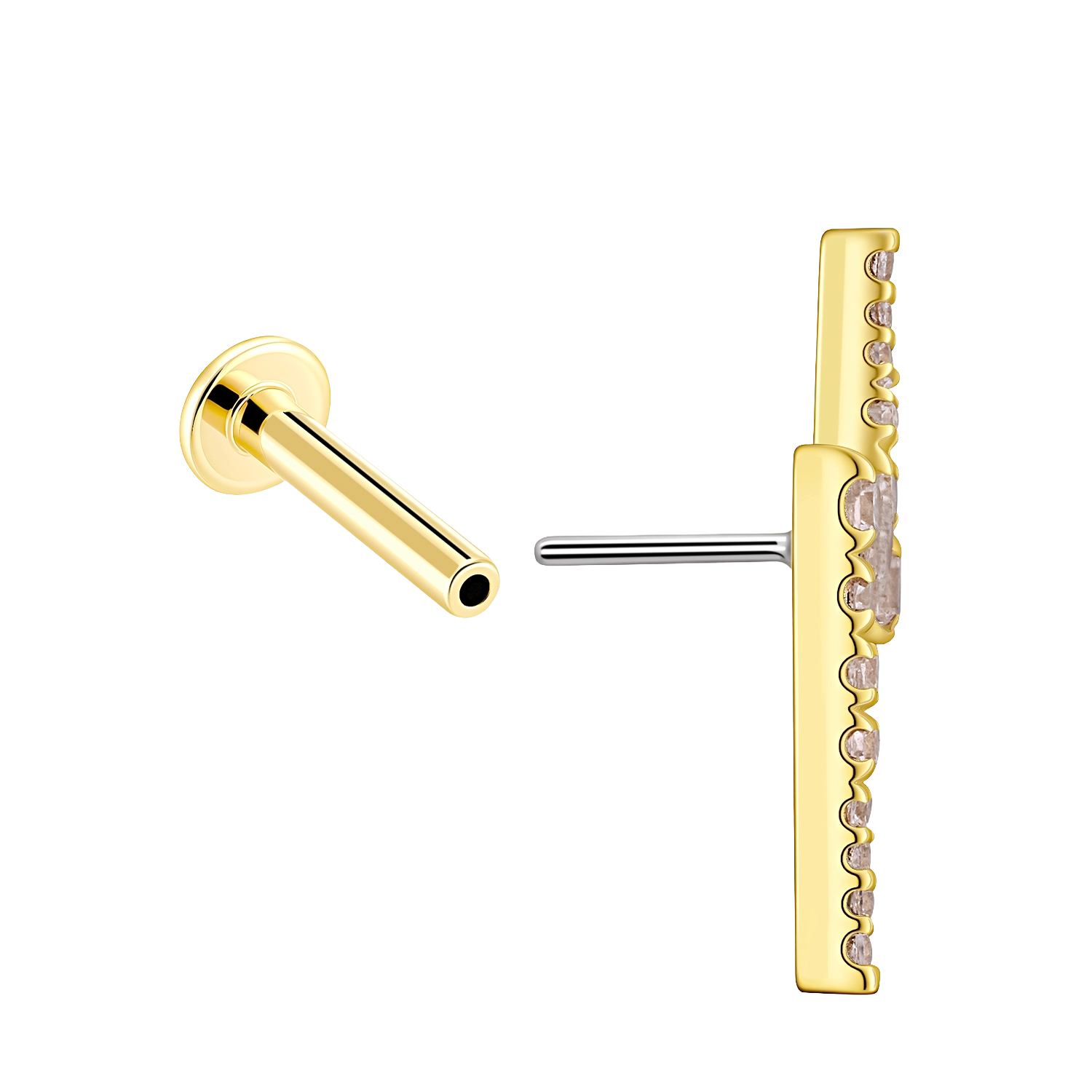 Made from 14K solid gold with CZ stone detailing in a lightning bolt design. Threadless labret stud style.