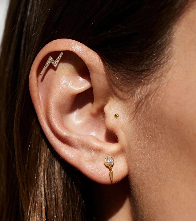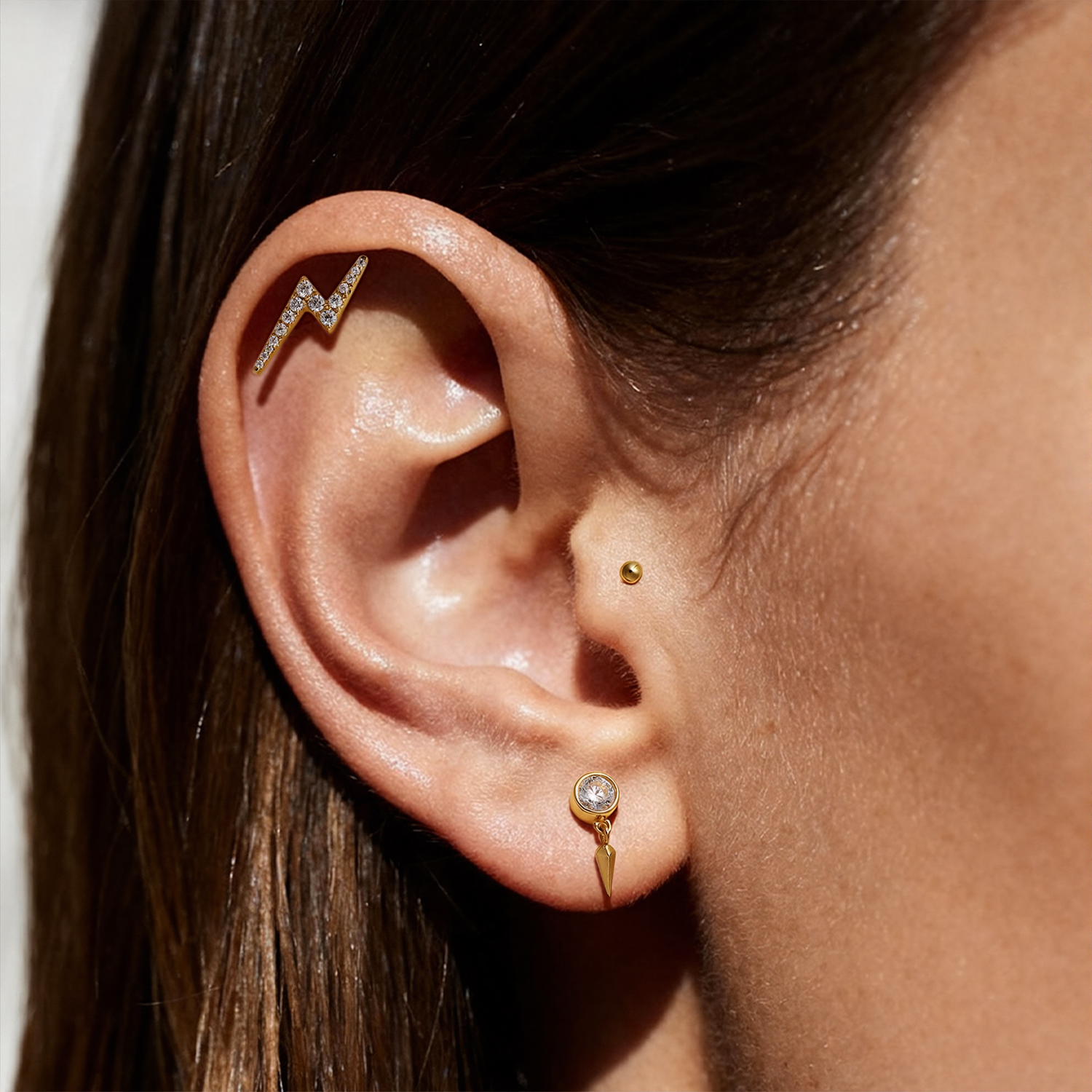 The bolt shape gives instant attitude, and the CZ stones add a crisp shine that catches light without feeling heavy. Wear it as a standout detail in your ear stack, or pair it with simple gold studs to keep the look polished and balanced.
