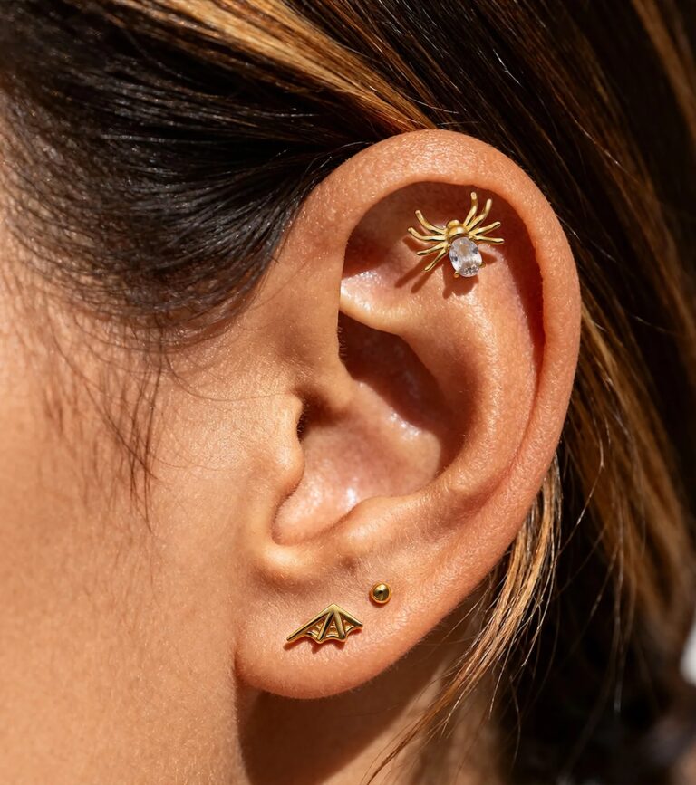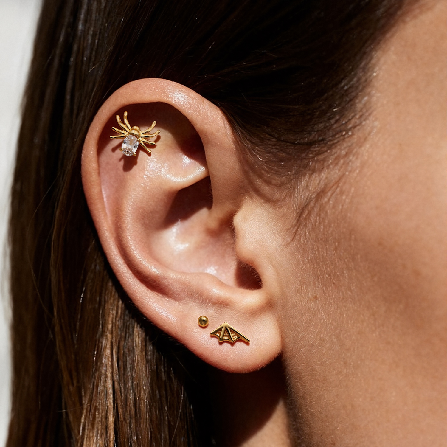 The spider shape adds attitude and personality, while the opal (or CZ) center gives a luminous highlight that keeps the look more elevated than “costume.” It’s a great choice when you want something expressive and unique, especially as a focal point in a curated ear stack.