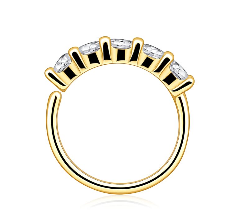 KB04G-2008 is a 14K solid gold seamless ring set with five aligned CZ stones for a clean, bright row of sparkle in a minimalist hoop.