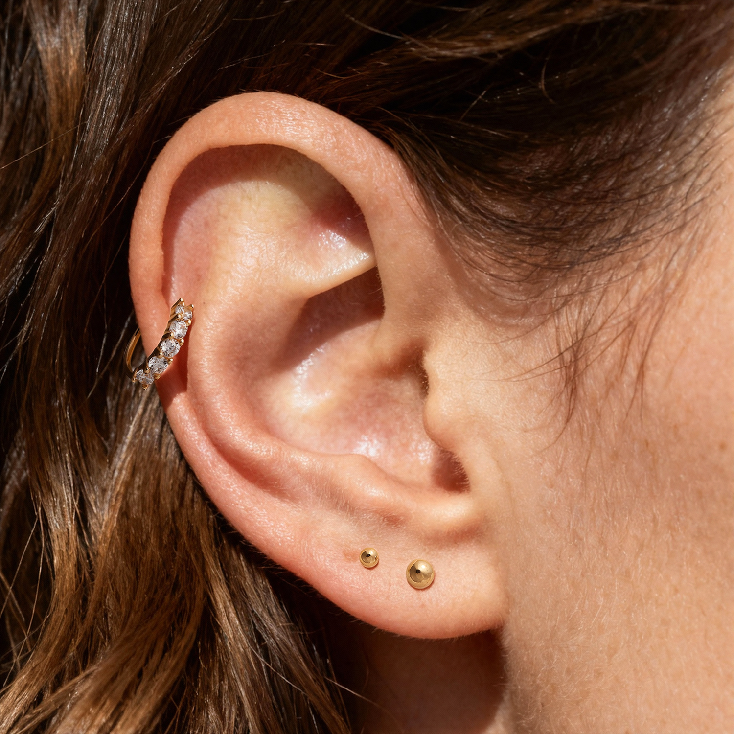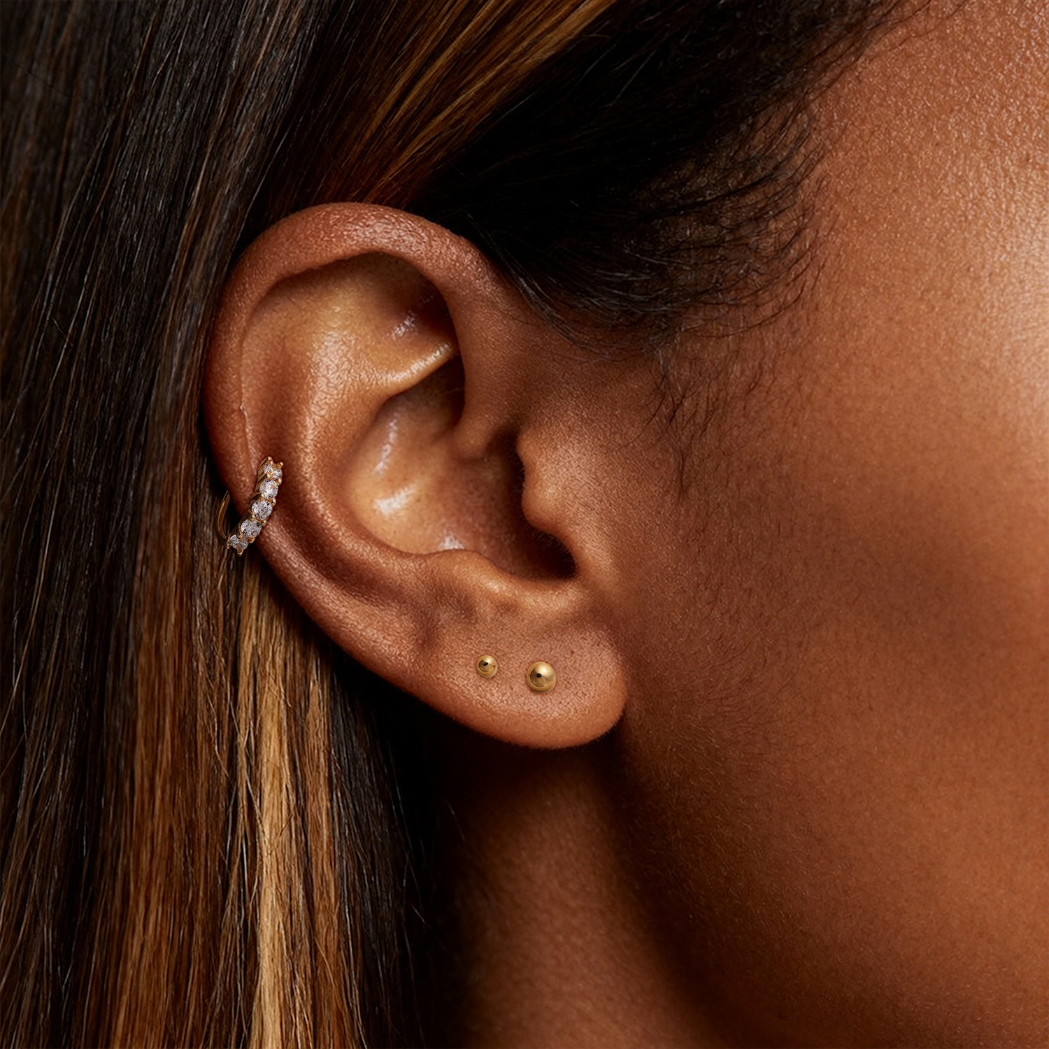 The aligned CZ stones create a crisp, straight shimmer that looks modern and balanced on a small hoop. It’s subtle enough for everyday wear, but polished enough to elevate a simple nose ring or a small lobe stack.