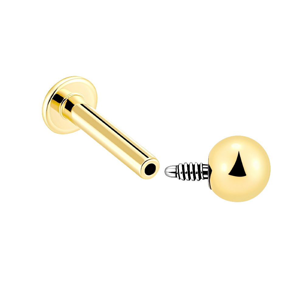 KE52G-3 is a 14K solid gold internally threaded labret stud with a smooth spherical top for a clean, seamless everyday look.
