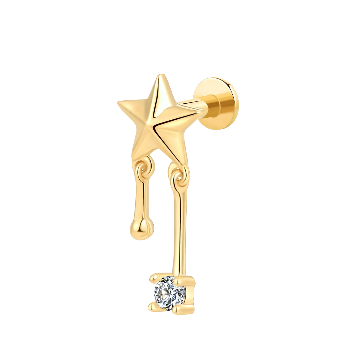 KEV2668G is a 14K solid gold internally threaded labret stud with a star-shaped top and a CZ dangle charm for a bright, playful sparkle with gentle movement. 14K Solid Gold + Stainless Steel Thread (0.9mm)