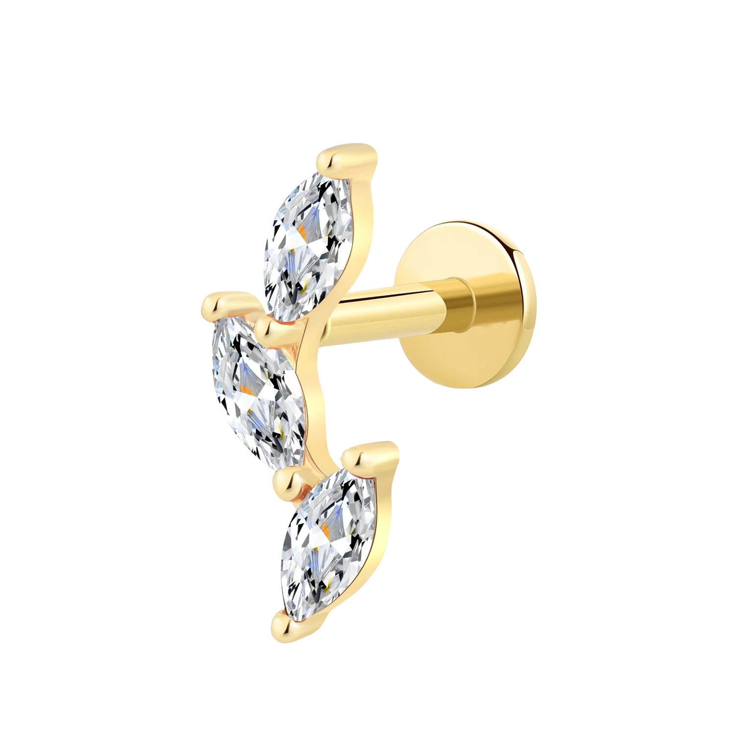 Introducing KFV3085G-CL – a dazzling piece of 14K gold piercing jewelry crafted for elegance and comfort. This threadless labret stud features a trio of marquise-cut CZ stones arranged in a graceful curve, offering a sophisticated sparkle for any ear or lip piercing. Made with a steel push pin and 14K solid gold, it combines durability with luxury. Perfect for your curated body jewelry collection, this piece is ideal for conch, helix, or tragus placements. A timeless choice for body piercing lovers.