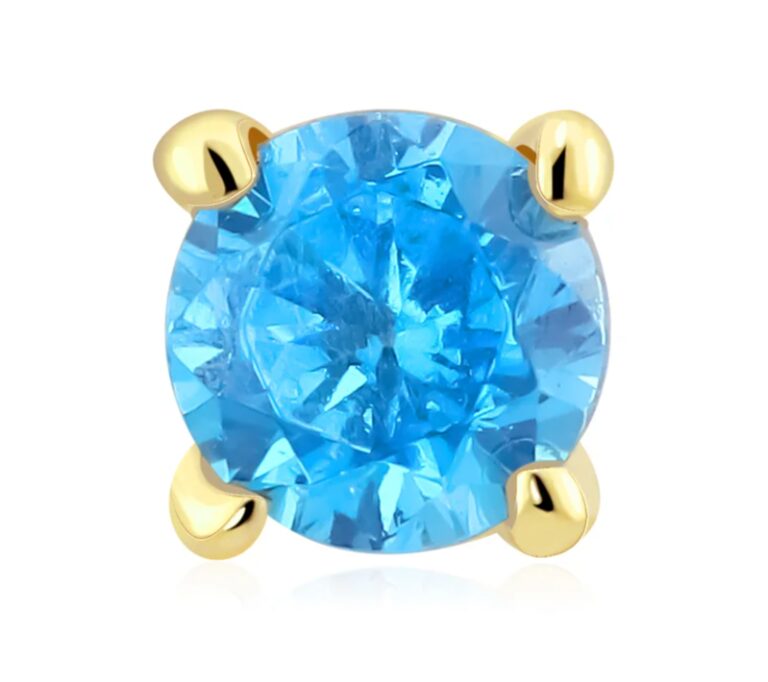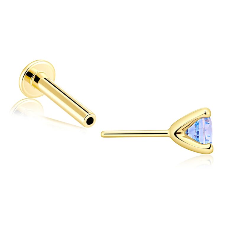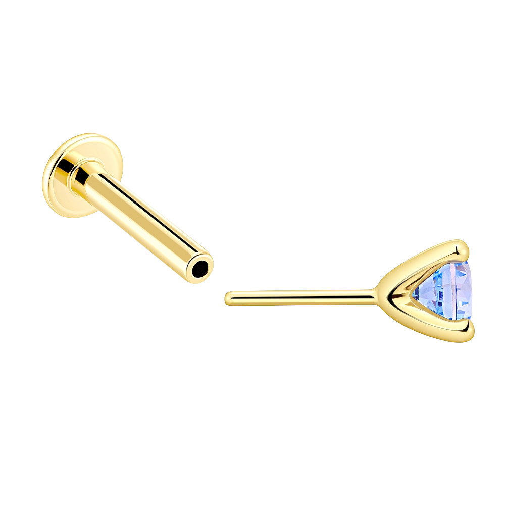 KF08G-AQ3KP is a 14K solid gold threadless labret stud finished with a colorful CZ stone for a bright, easy-to-style pop of color.