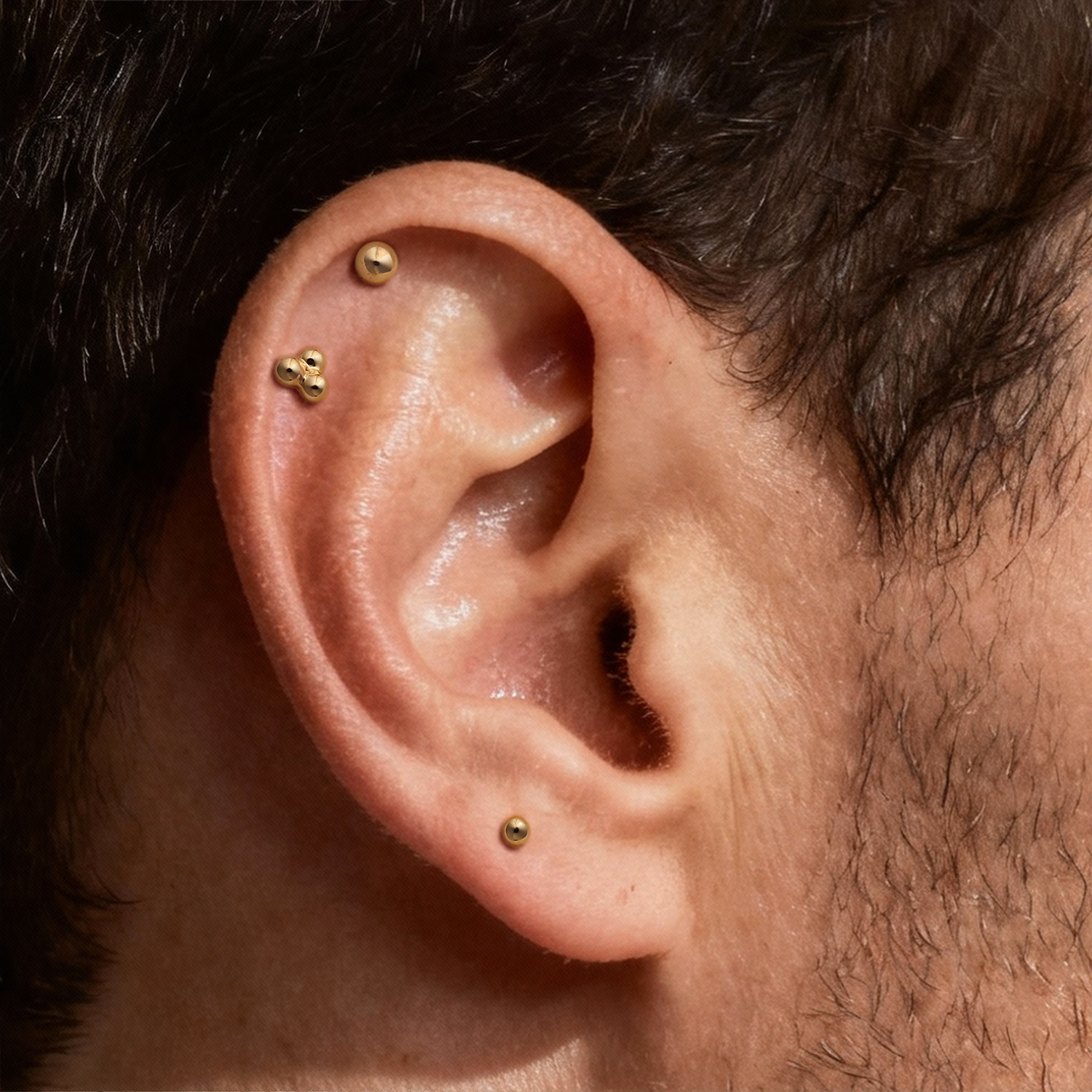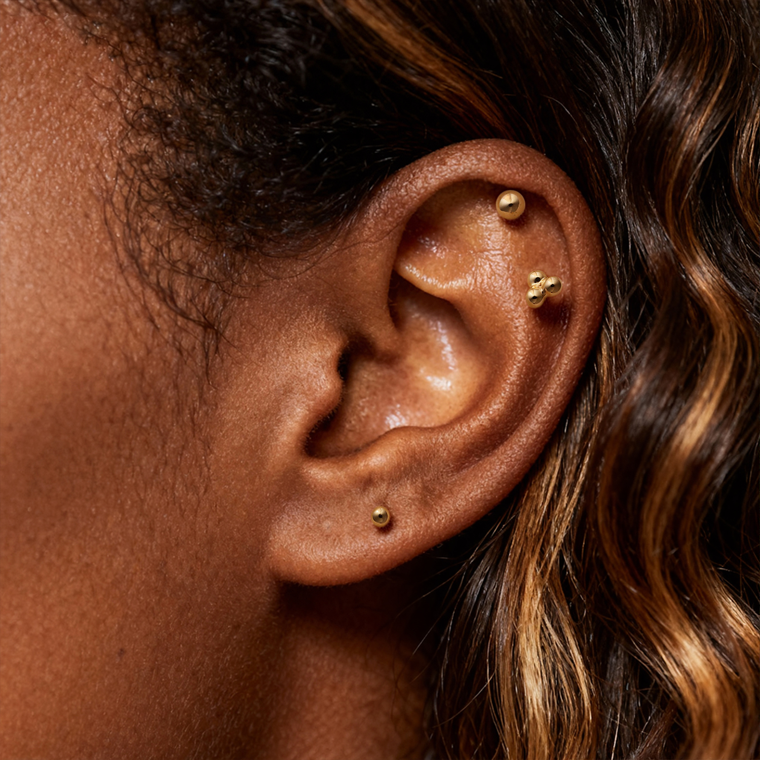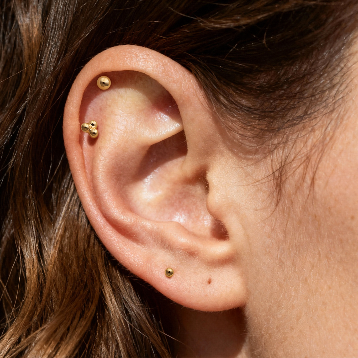 Three smooth half spheres create a structured look that feels modern and understated. It adds dimension to a stack while staying easy to pair with plain studs, hoops, or other simple gold pieces.